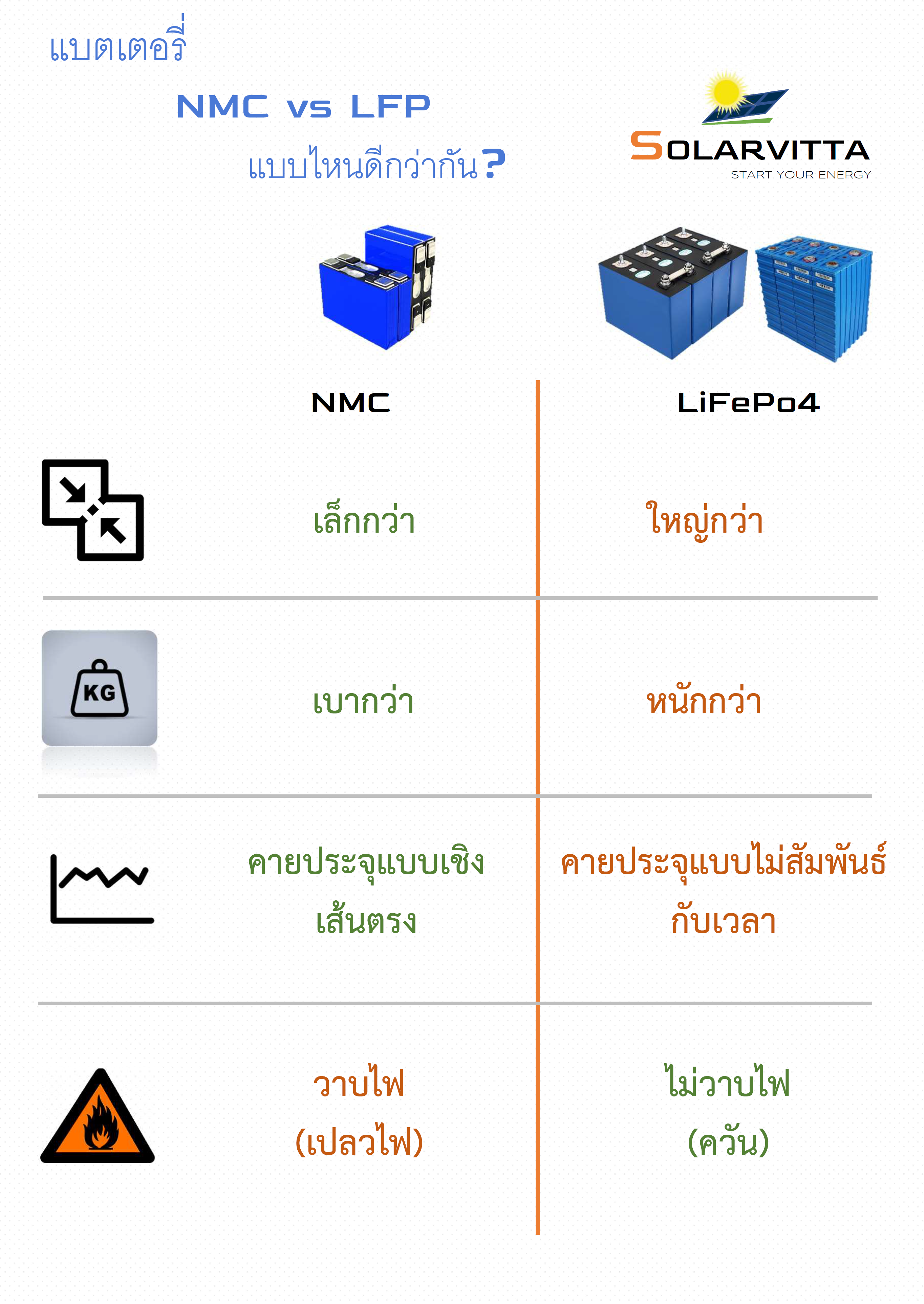แบตเตอรี่ลิเธียมที่นิยมใช้ในโซล่าเซลล์ มีหลักๆอยุ่ 2 ประเภท คือ NMC กับ LFP (LiFePo4)