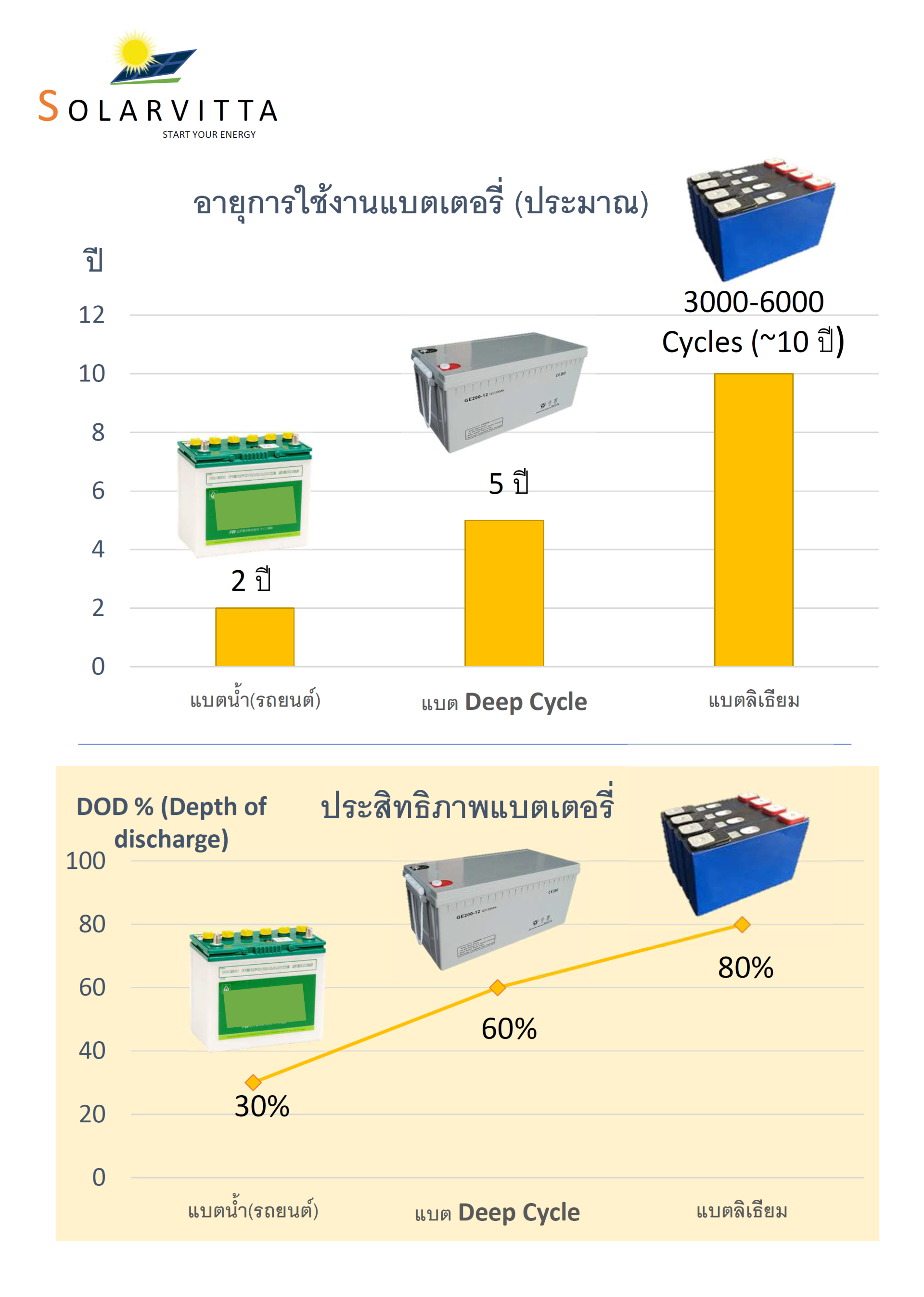 2.แบต Deep cycle- ผลิตมาเพื่อระบบโซล่าเซลล์ ให้ประสิทธิภาพได้ดีกว่าแบตน้ำ มีอายุการใช้งานประมาณ 5 ปี แลกมาด้วยราคาที่แพงกว่าแบตน้ำแต่ให้ค่า DOD (Depth of Discharge) ถึง 50-60% โดยประมาณ